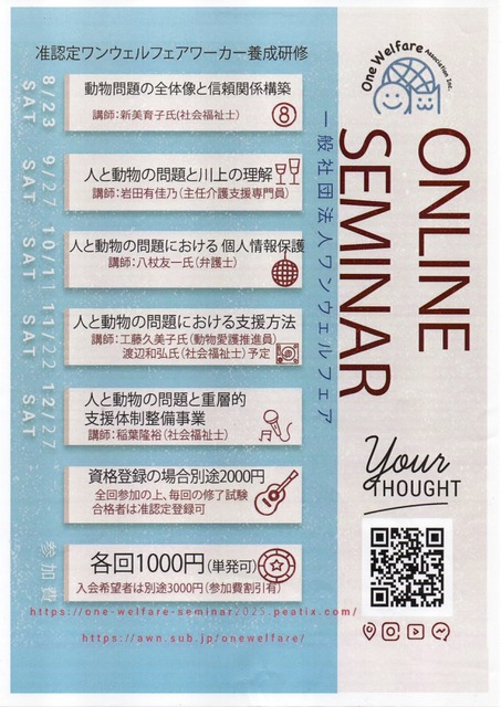 (一社)ワンウェルフェア・ワーカー養成研修 2025年8月23日 最終更新日時 : 2025年8月23日 Nekodasuke 開催日: 2025年11月22日 19:00 - 20:00カテゴリー: セミナー/講演会 日時:2025年11月22日(土) 4回目:講師・工藤久美子(NPOねこだすけ代表、東京都動物愛護推進員)詳しい内容は「オンライン連続セミナー」にて